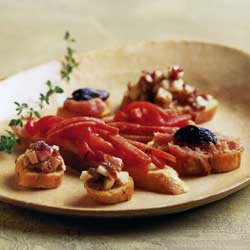 Spread or spoon a small amount of each topping onto 6 half- slices of the toasted bread. Arrange on a platter and serve at once.