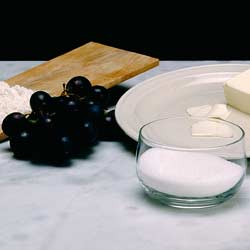 della pasta e metterla in una teglia ricoprendola con chicchi d'uva nera