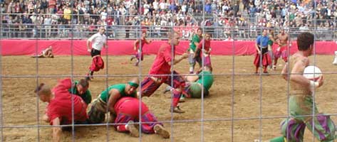 Pieces of ear have been spat onto the playing field in the Piazza Santa Croce a long time before Tyson got his first bite in the ring. Broken noses are standard, other bone fractures more rare, and punches and kicks are part and parcel of the game. The word 'calcio', used in Italy for 'soccer', actually means 'kick'.