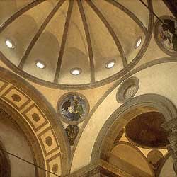 Andrea de' Pazzi made a substantial donation to obtain the right for members of his family to be buried there, but no one ever was because after their unsuccessful conspiracy in 1478, the whole family was exiled. The importance of this chapel is due to its very particular construction. Here Brunelleschi brought all his architectural studies into play - indeed, this chapel is said to have achieved "a harmony of square and circle".